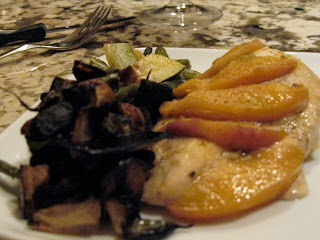They made peach-ginger baked chicken with grilled vegetables on the side. That black stuff on the left is onions, zucchini, eggplant and green beans that have been grilled in a mesh pan until DELICIOUS. Don’t let the lack of color freak you out!