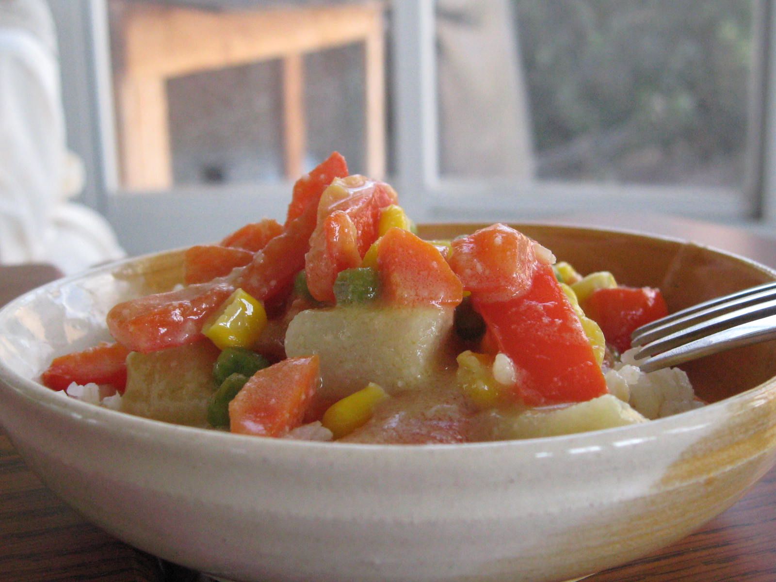 2. While the coconut milk is warming, peel and chop the potato and carrots and slice the bell peppers.