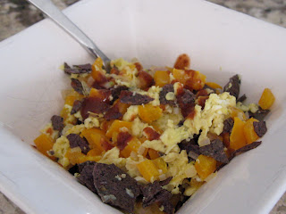 I tried a little variation for breakfast yesterday – MIGAS! I snagged this recipe from Jenna, cut it in half and substituted baked blue corn tortilla chips for regular fried, and shallots for onions.