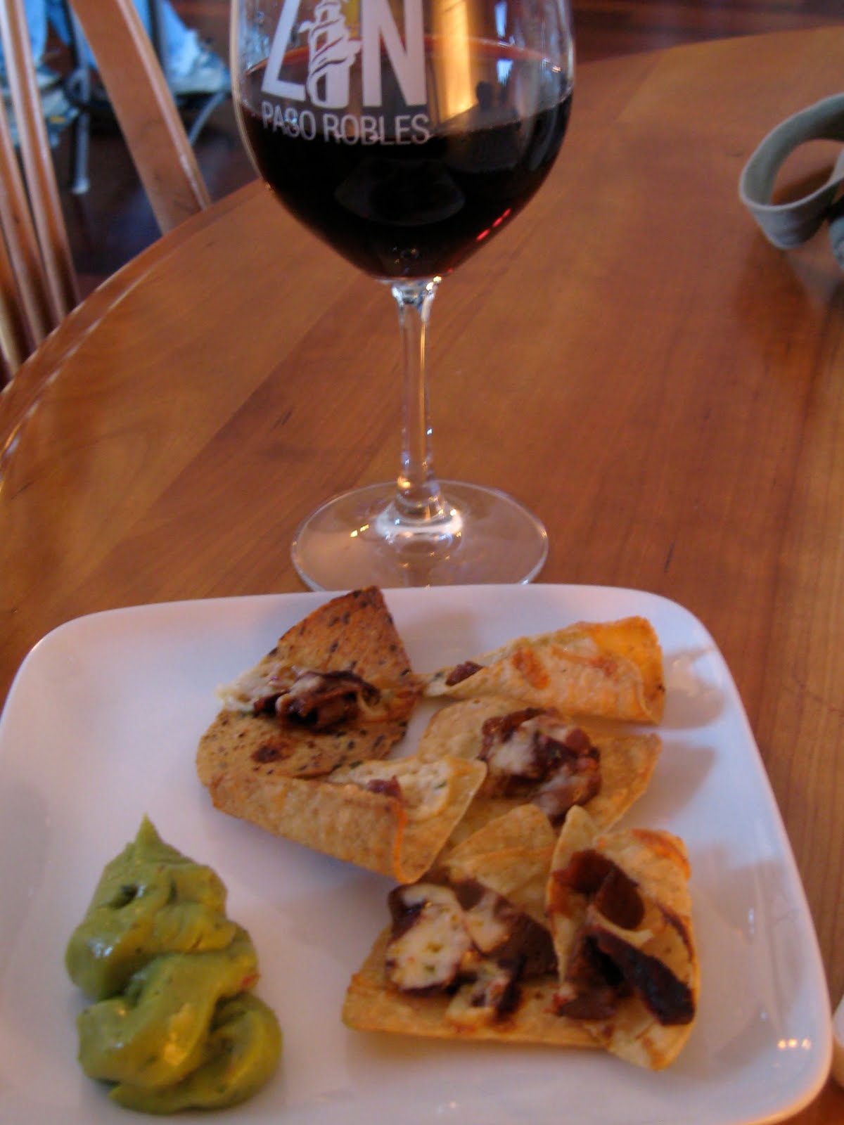 Fancy nachos! Soy and flaxseed tortilla chips with leftover tri-tip, chipotle peppers covered in pepperjack cheese and guacamole. Guacamole from a bag. It looks awful, I know. Red wine, for the win!