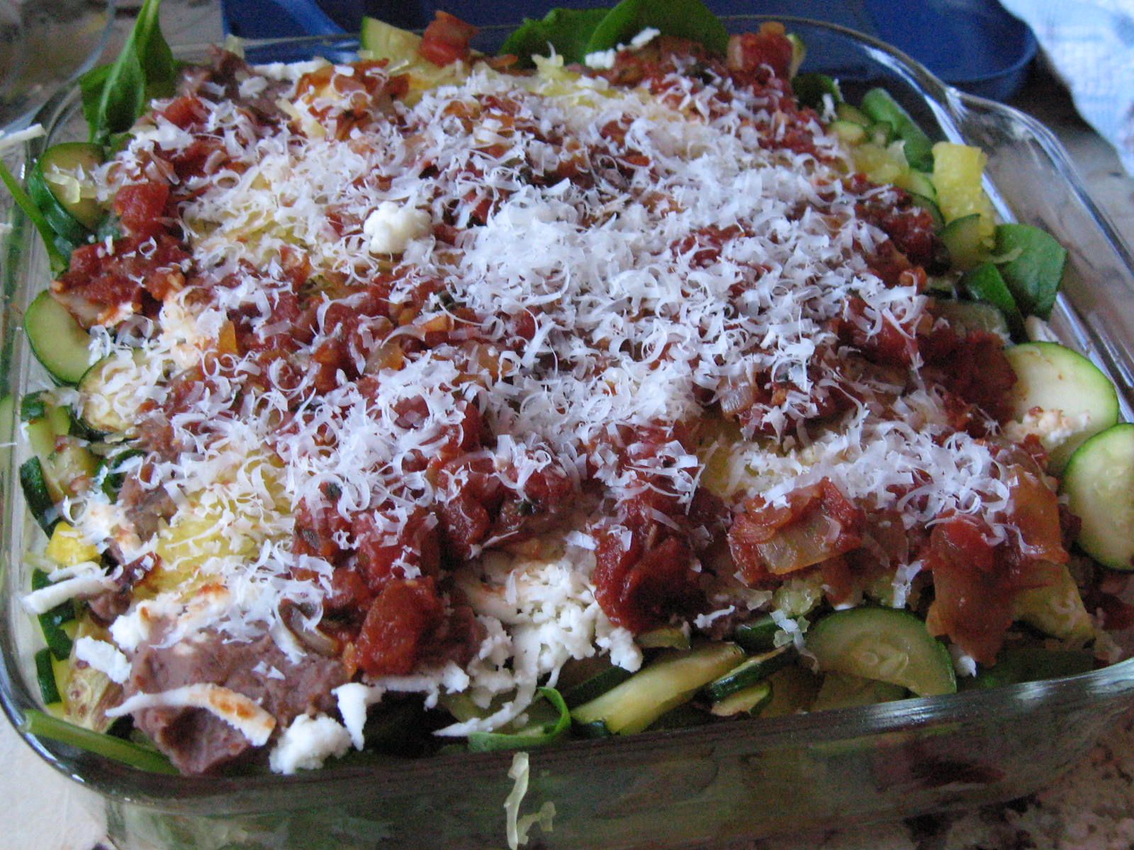 10. In a baking dish sprayed with olive oil (I used a small square dish, but I’d recommend a 9×13 to avoid overflowing) layer marinara, spaghetti squash, zucchini, black beans, spinach, grated mozarella, ending with a final layer of squash and marinara.