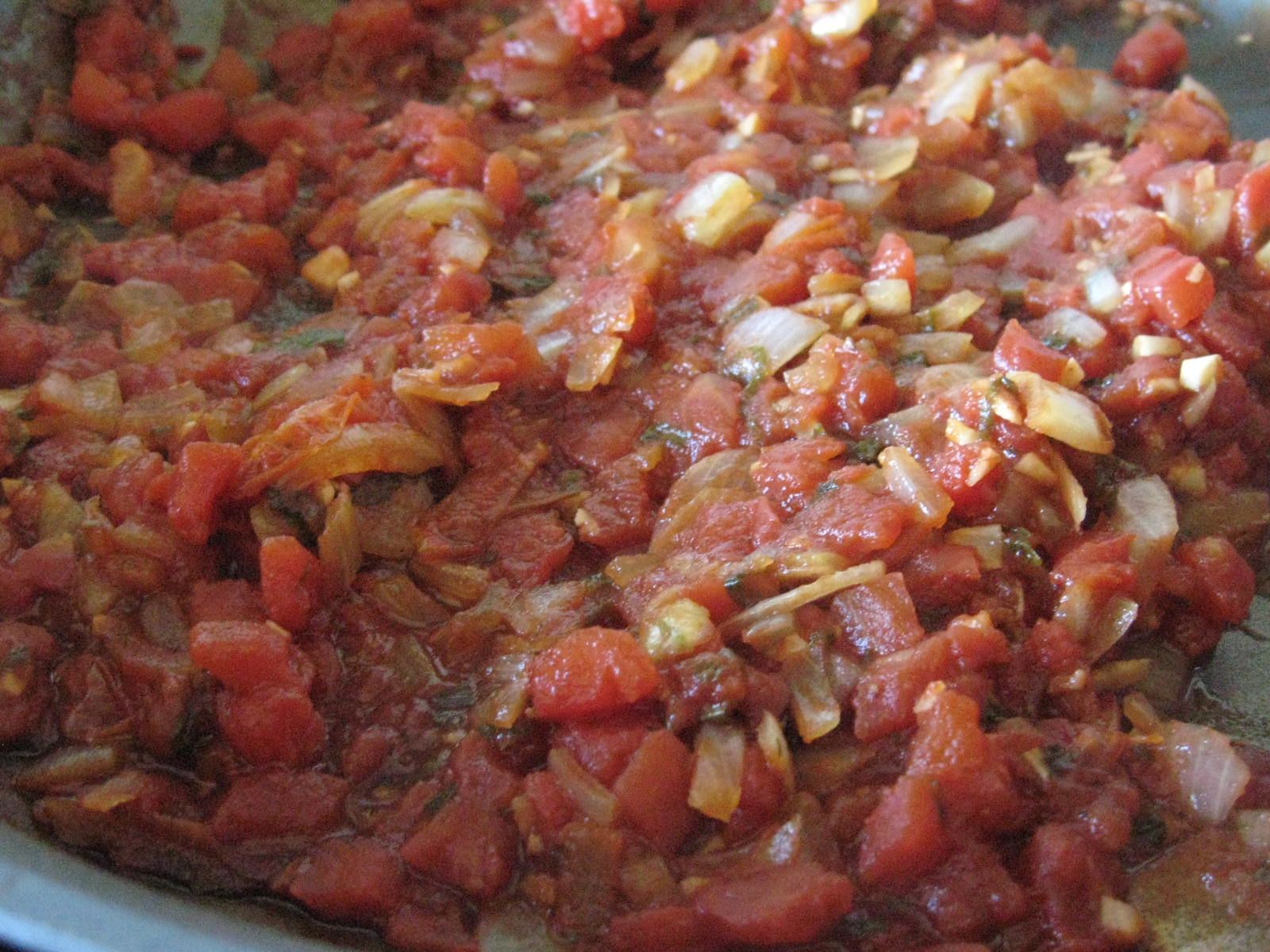 8. Add the diced tomatoes, salt, pepper and basil. Bring the pan to a boil, then reduce to medium heat until the sauce has thickened, about 15 minutes.