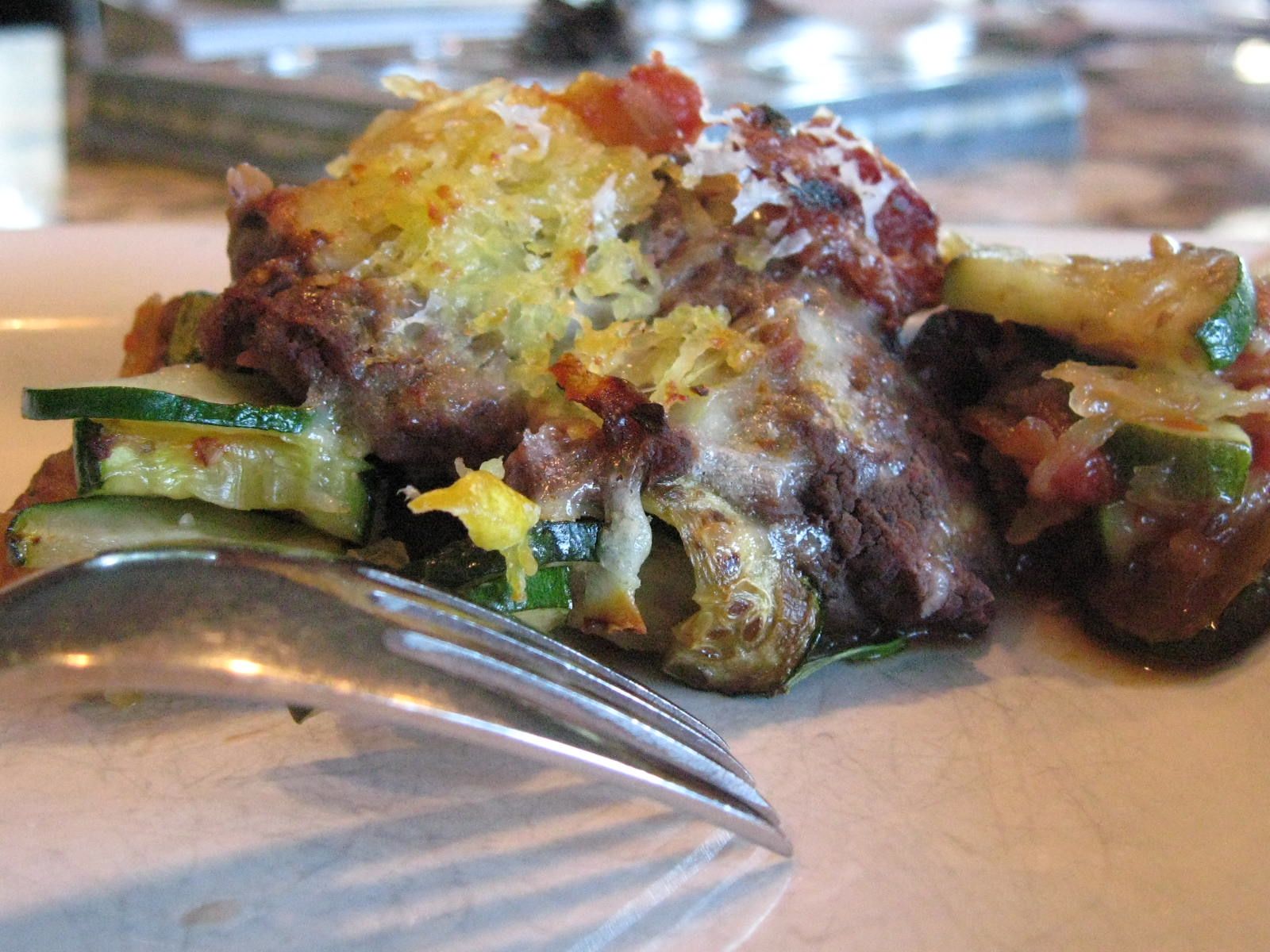 10. In a baking dish sprayed with olive oil (I used a small square dish, but I’d recommend a 9×13 to avoid overflowing) layer marinara, spaghetti squash, zucchini, black beans, spinach, grated mozarella, ending with a final layer of squash and marinara.