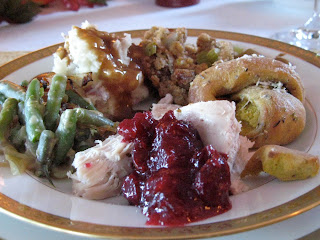 My one (and only) plate. Clockwise from the top: homemade whole wheat stuffing, a pumpkin knot, turkey with the most amazing cranberry sauce in the world, green bean casserole made with fresh green beans and homemade vegan cream of mushroom soup and caramelized onions, and mashed potatoes with gravy.