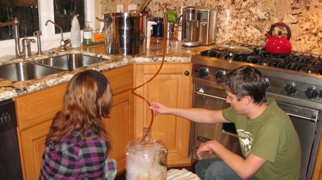 After draining the sanitizing fluid, we siphoned the beer directly from the boiling pot into the carboy.
