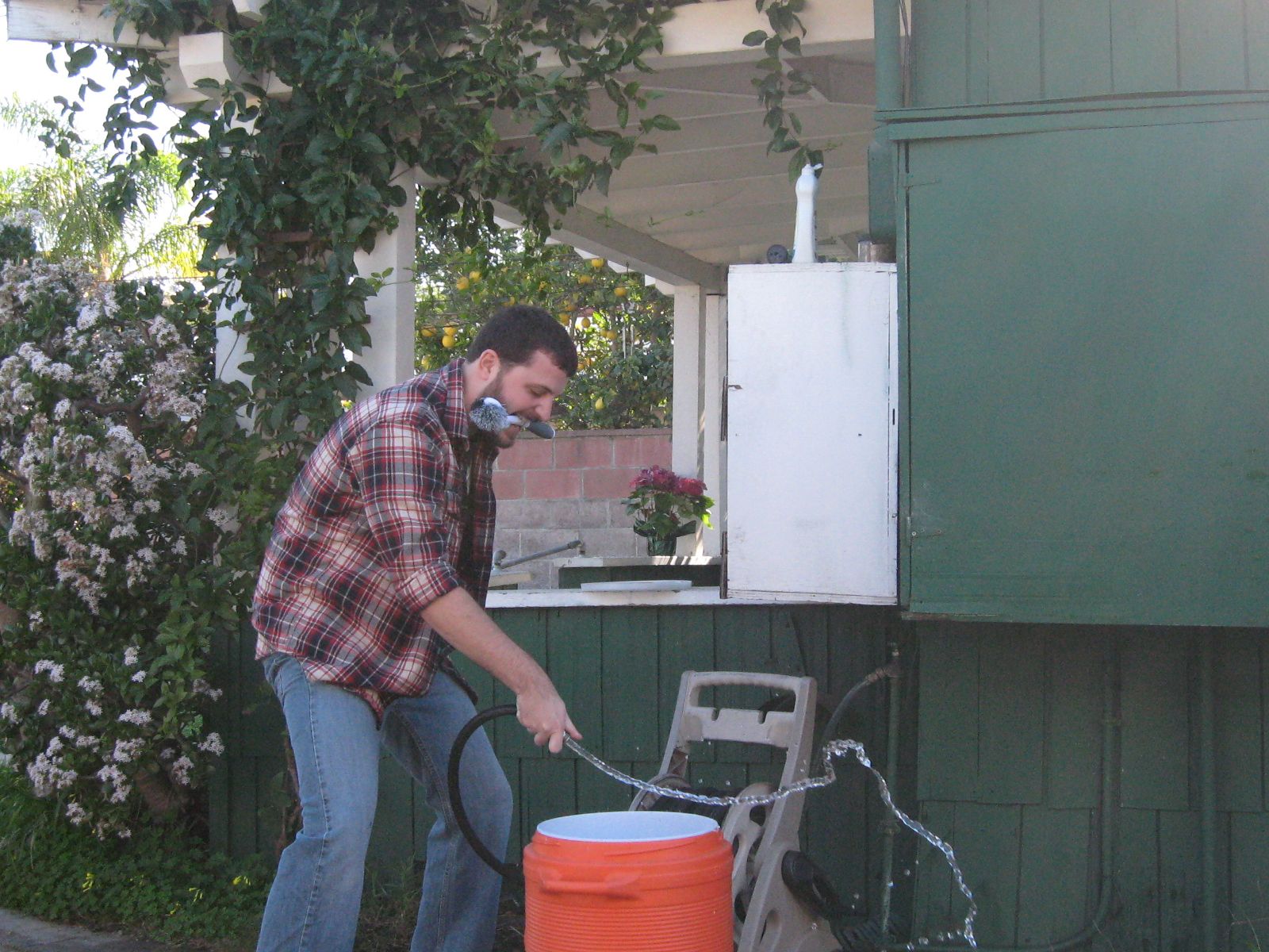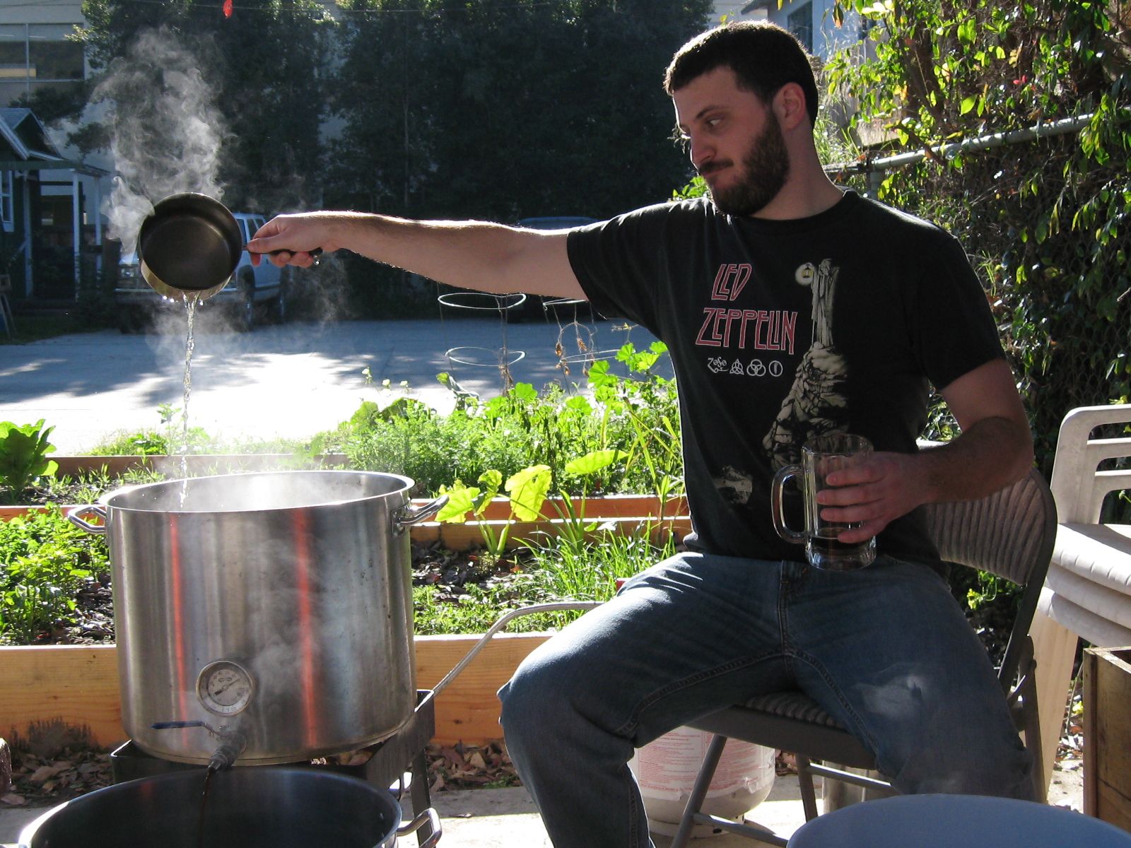 Grayson the Scholar sparging his mash in a studious manner.