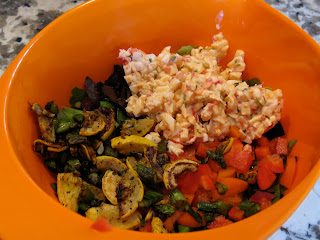 This had an entire bag of chopped baby greens, 1/2 a chopped bell pepper, a cup of sauteed yellow squash and asparagus that was liberally sprinkled with Herbes de Provence, 1/2 a cup of warmed lentils and a cup of egg white salad with 1 teaspoon of homemade dressing.