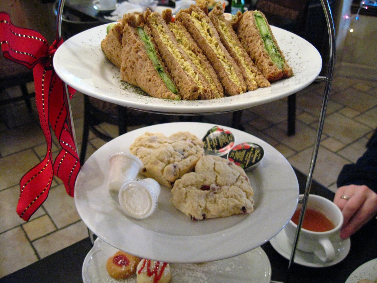 The traditional tea sandwiches were cucumber-thyme, and curry chicken salad (which was Ah-MAY-Zing!). The Tuscan tea had finger sandwiches with tomatoes, avocado and fresh mozzarella. Oh yeah, I already failed a little on my no dairy – just a tad of mozzarella. Oops.