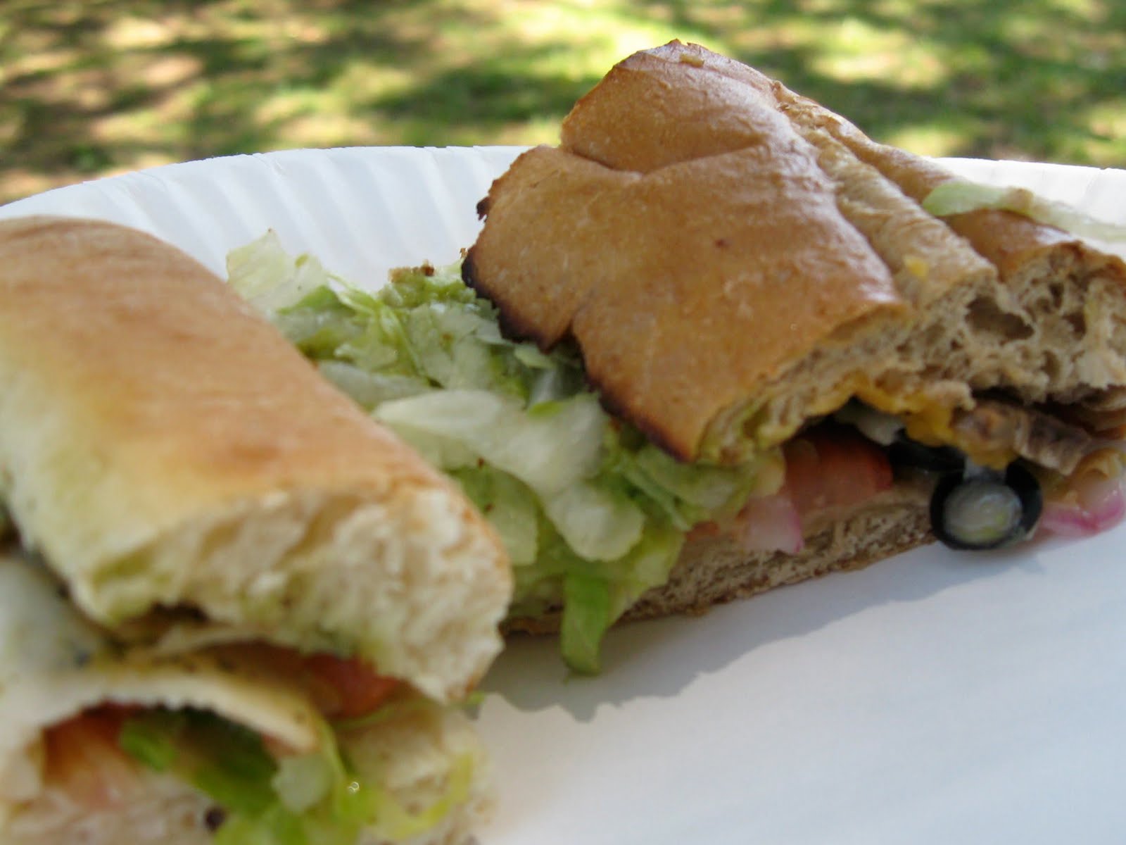 A section of a chicken and pesto sammich, and a veggie sammich.