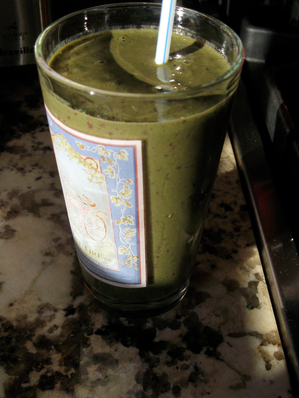 A sunrise monster! This has 3 cups of spinach, 3/4 a cup of unsweetened soymilk, 1/8 a cup of frozen berries, 1/2 a banana and the juice of 1/2 a lemon. Perfect to sip at 6:30am when the temperature is already 81F outside. Summer is officially here!