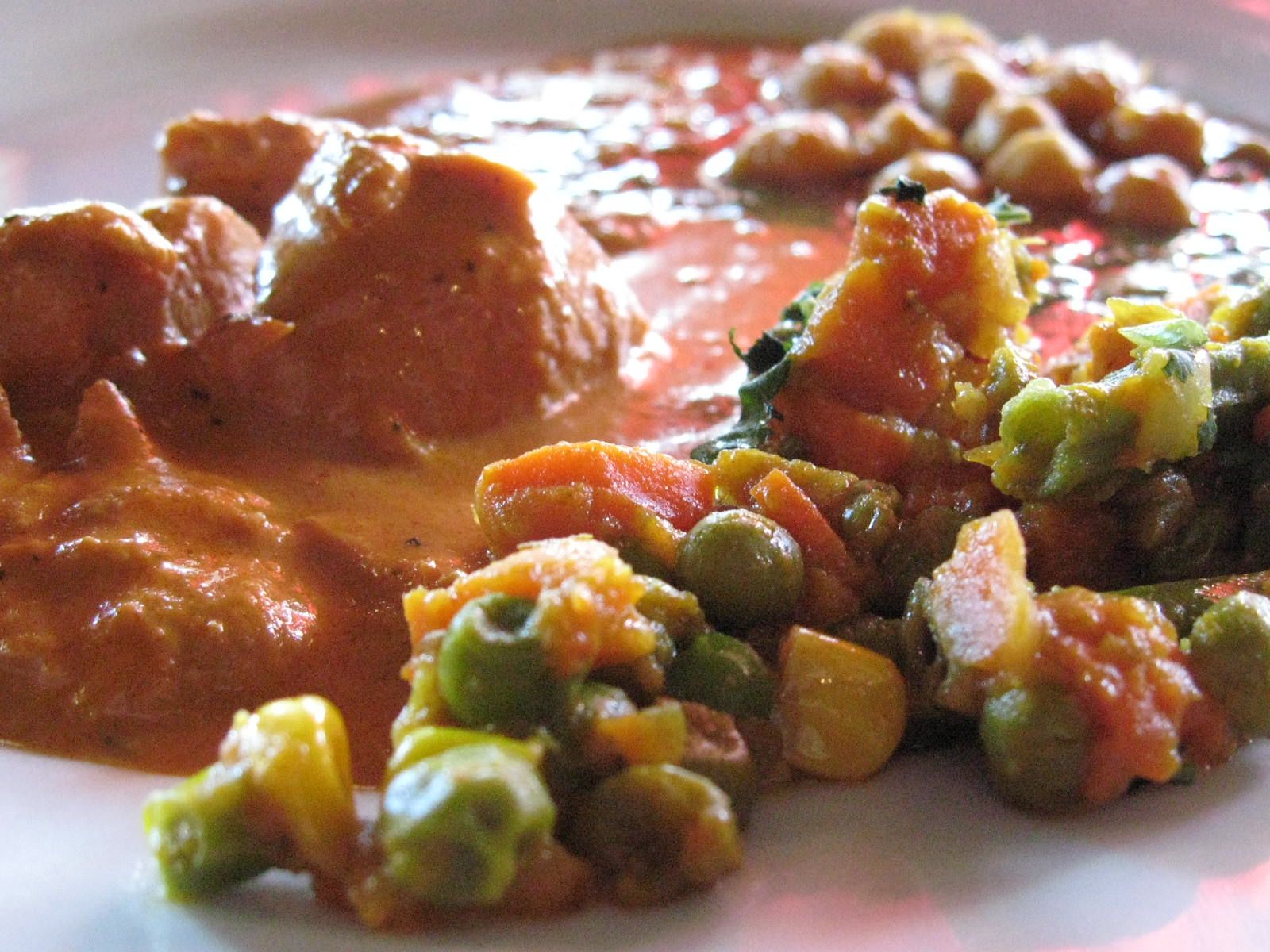 Chicken tikka masala, ridiculously spicy vegetables, daal and chana masala. I had a few pieces of chicken and massively regretted it later. After two weeks of no meat, I had a stomachache for the rest of the day!