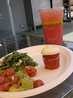 My plate consisted of: Avocado, cherry tomatoes, and pine nut salad tossed in a lime vinaigrette, and the mission fig, arugula, and blue cheese salad tossed in a balsamic dressing. They were both delicious, but the fig and arugula salad had a little too much dressing, whereas the avocado and cherry tomato salad could have used a little more. Dessert was a mini red velvet cupcake. The frosting on this was to die for!!! The cupcake itself was a little dry and boring, but the frosting more than made up for it.